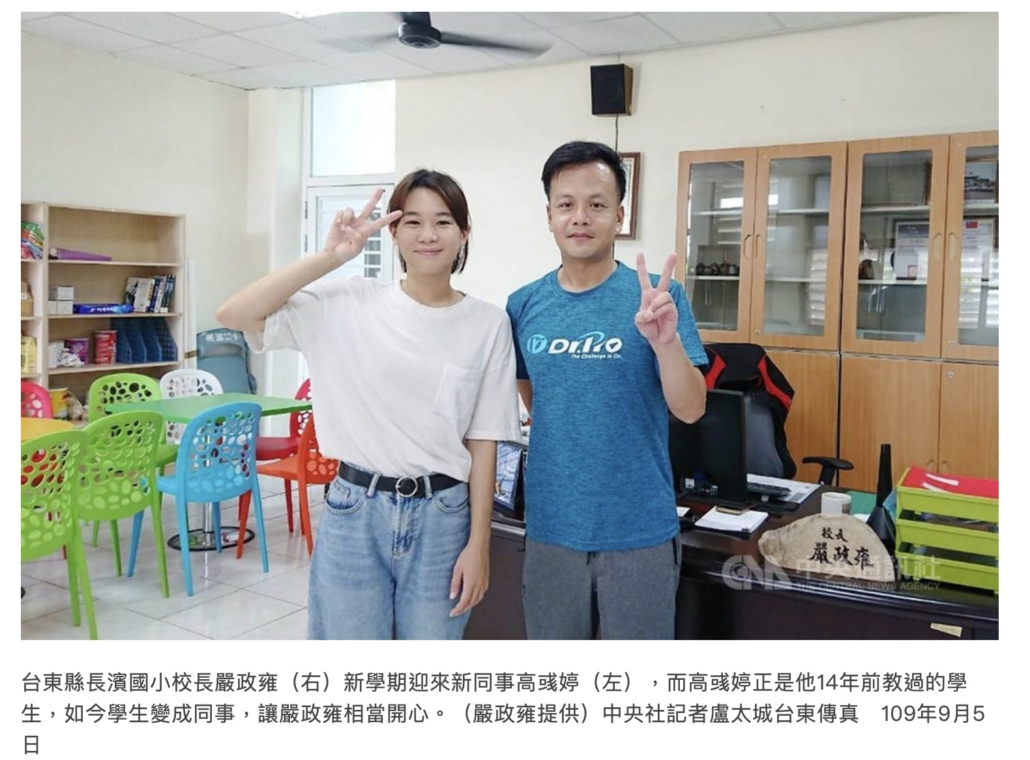 (中央社記者盧太城台東縣5日電)開學了,許多學校教學陣容注入新血,台東縣長濱國小校長嚴政雍、蘭嶼鄉椰油國小主任顏子矞,10多年前教過的學生,這學期都成為自己的新同事,為台東偏鄉教育增添佳話。